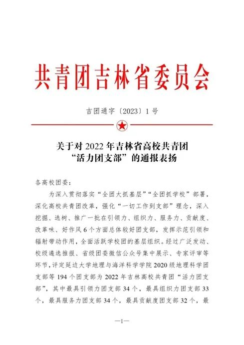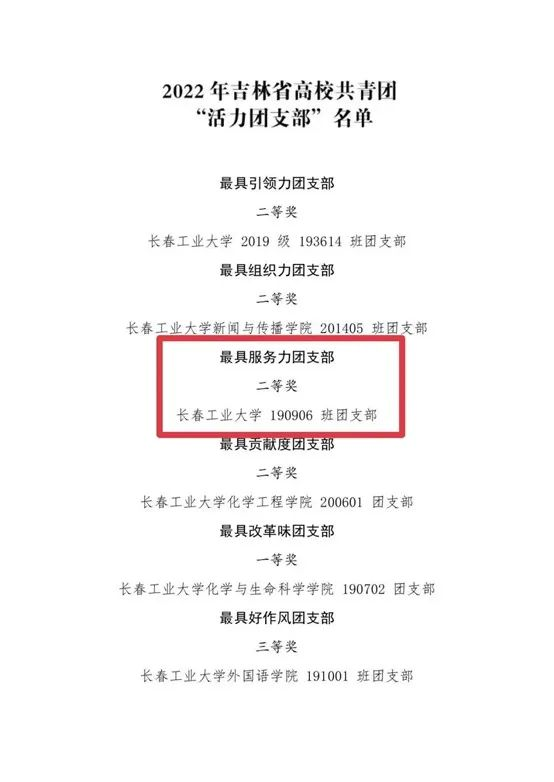 为深入贯彻落实“全团大抓基层”“全团抓学校”部署,深化高校共青团改革,强化“一切工作到支部”理念,深入挖掘选树,推广一批在引领力、组织力、服务力、贡献度、改革味、好作风6个方面总体较好团支部,发挥示范引领和辐射带动作用,全面活跃学校团的基层组织。在学校党委的正确领导下,bat365中文官方网站团委积极进取,探索创新,在2022年吉林高校共青团“活力团支部”评选中,bat365官网190906团支部荣获“最具服务力团支部”称号。
