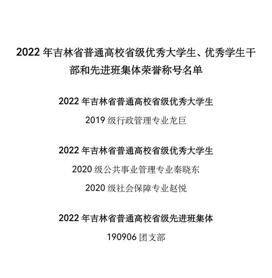 2022年,全省高校深入学习贯彻习近平新时代中国特色社会主义思想和党的二十大精神,全面贯彻党的教育方针,坚持立德树人根本任务,勇担为党育人、为国育才使命,培养德智体美劳全面发展的社会主义建设者和接班人,涌现出了一批优秀大学生、优秀学生干部和先进班集体。bat365官网在此次评比活动中斩获佳绩,其中2019级行政管理专业龙巨荣获省级优秀学生干部称号,2020级公共事业管理专业秦晓东、社会保障专业赵悦获得优秀大学生称号,190906团支部获得省级先进班集体称号。