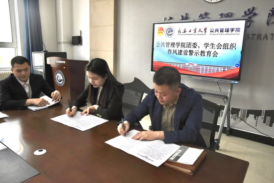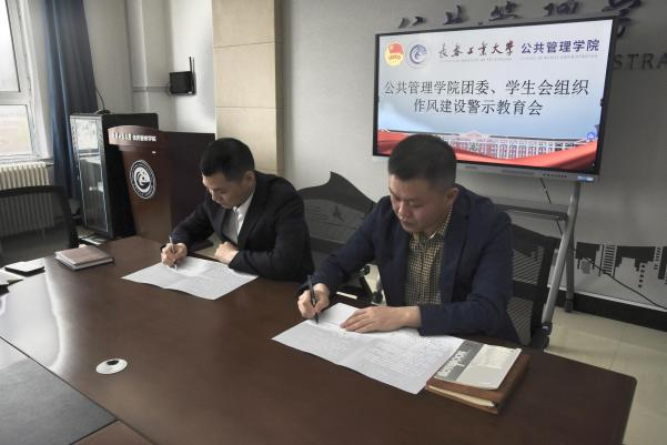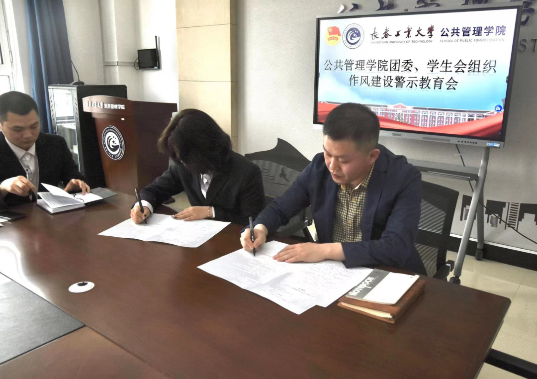 各部门负责人员认真聆听陈磊老师的讲话后,在《bat365中文官方网站学生会组织工作人员承诺书》中签字。