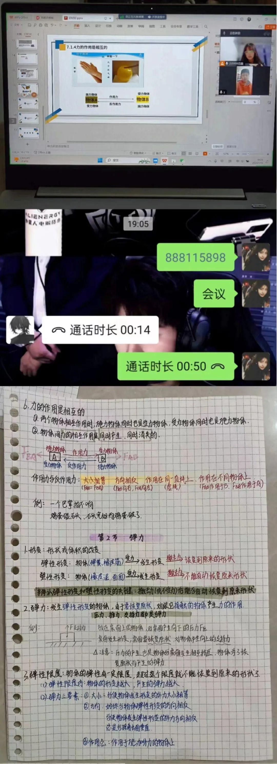 这是我第一次报名参加“学伴+”志愿服务活动,心境从刚开始的无从下手到后来到游刃有余,我非常享受这一过程。我的学伴服务对象是初二的一名学生,主要负责物理和数学教学。由于一些客观因素,我们实行了线上教学。我首先上网查阅教材,做出教案和PPT,总结出本节课的知识点,在熟悉教案和PPT后,搜集并了解网上的其他讲师授课方式,进而进行线上教学,并在课后整理出了课堂笔记传给学伴服务对象。