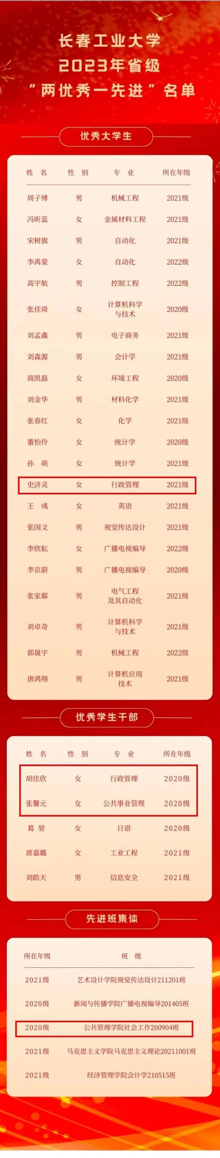 2023年,学院深入学习贯彻习近平新时代中国特色社会主义思想和党的二十大精神,全面贯彻党的教育方针,坚持立德树人根本任务,勇担为党育人、为国育才使命,全面培养德智体美劳全面发展的时代新人,涌现出了一批先进学生个人和集体,充分展现了学院思想政治教育工作成效和人才培养质量。希望广大公管新青年学习先进、争当先进,涵养进取品格、笃行强国之志,踔厉奋发、勇毅前行,在实现中华民族伟大复兴的时代洪流中贡献公管学子的青春力量。