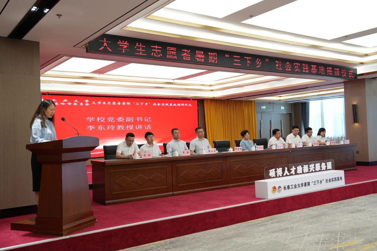 李东玲在仪式上发表讲话。她指出,bat365中文官方网站与公主岭市因“硕博人才助振兴计划”的实施而校地合作结缘,建立了良好的共建关系。学校把大学生志愿者暑期“三下乡”社会实践活动与“硕博人才助振兴计划”项目有机结合,将以此次活动为契机,不断引领青年学生扎根基层,到基层一线贡献才智、增长才干,为吉林省全面振兴率先实现新突破贡献工大力量!同时希望参与本次实践活动的大学生志愿者们投入真情、做出贡献、收获实效,将小我融入大我,将青春献给祖国,展现新时代工大青年的青春风采,奋力书写为中国式现代化挺膺担当的青春篇章。