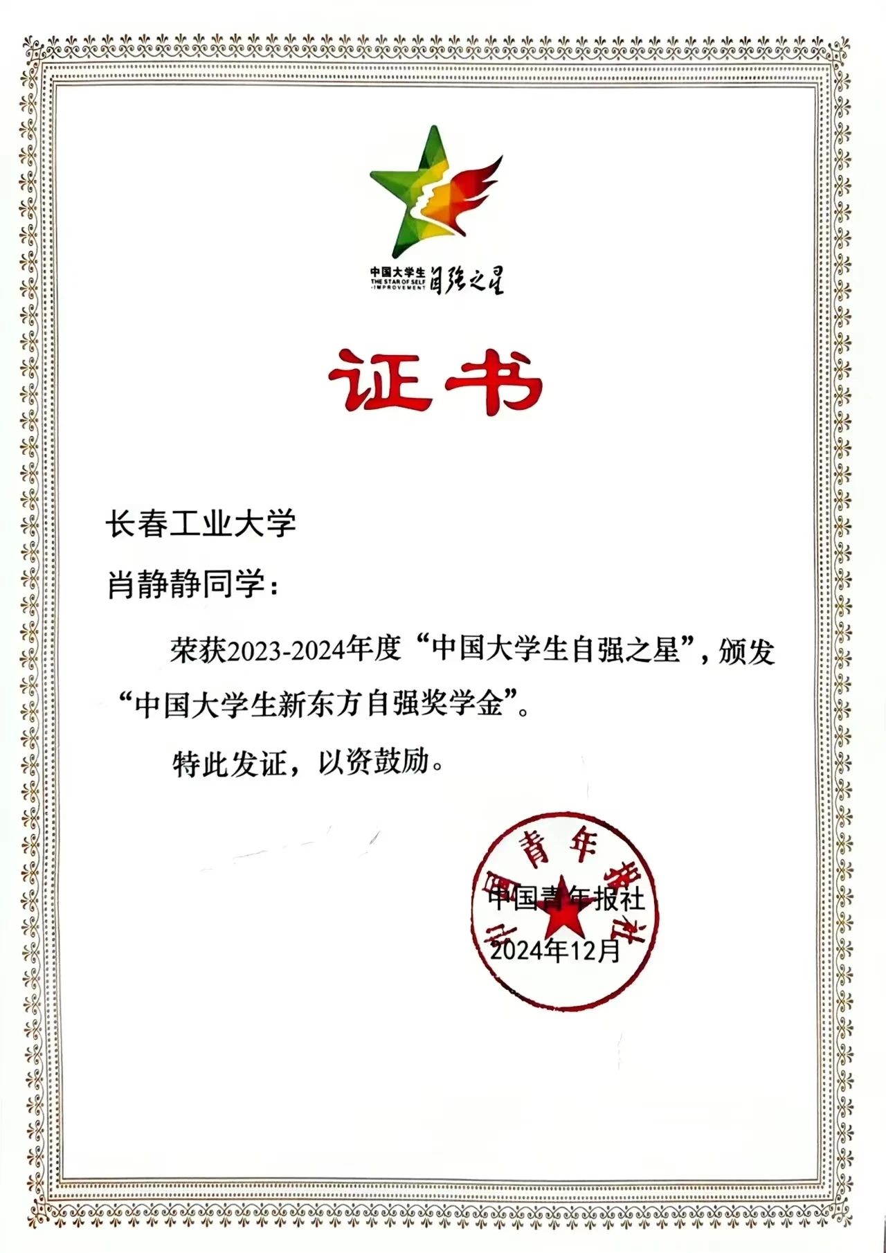 喜报!bat365官网肖静静同学获得2023-2024年度“中国大学生自强之星”荣誉称号
