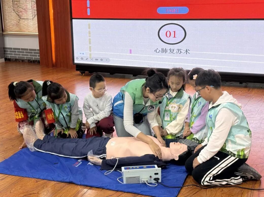 在应急知识培训与技能实操环节,韩钰琪同学讲解了地震应急知识,小朋友们攥着笔记本,把“躲桌下、护头部、忌乘梯”的要点记满纸面;赵锦秀、王小萌同学示范了心肺复苏与伤口包扎技术,孩子们踮着脚围观,举手时眼里满是“我想试试”的期待—当一个小女孩在王小萌同学的指导下,小心翼翼地为“伤员”缠好纱布时,她抬头说“以后我也能保护同学了”,这句话让大学生瞬间懂得:公共管理专业能力建设只有紧贴基层群众需要才有前途、有力量。