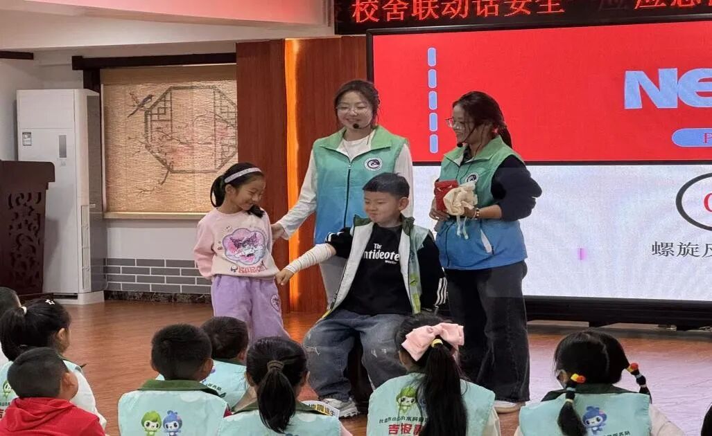 在地震情景剧展演环节,大学生通过表演还原地震中的避险与互助场景,随后邀请小朋友们上台模仿,当看到孩子们学着剧中角色“安抚同伴”“有序撤离”时,我们深刻体会到:这种以学生为中心的学导结合课堂,才是学生真正需要的课堂。