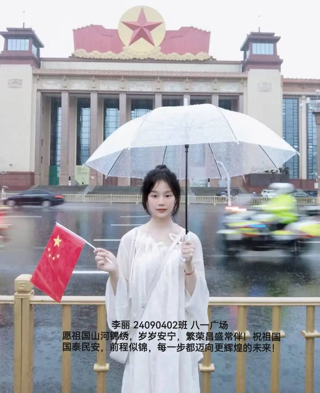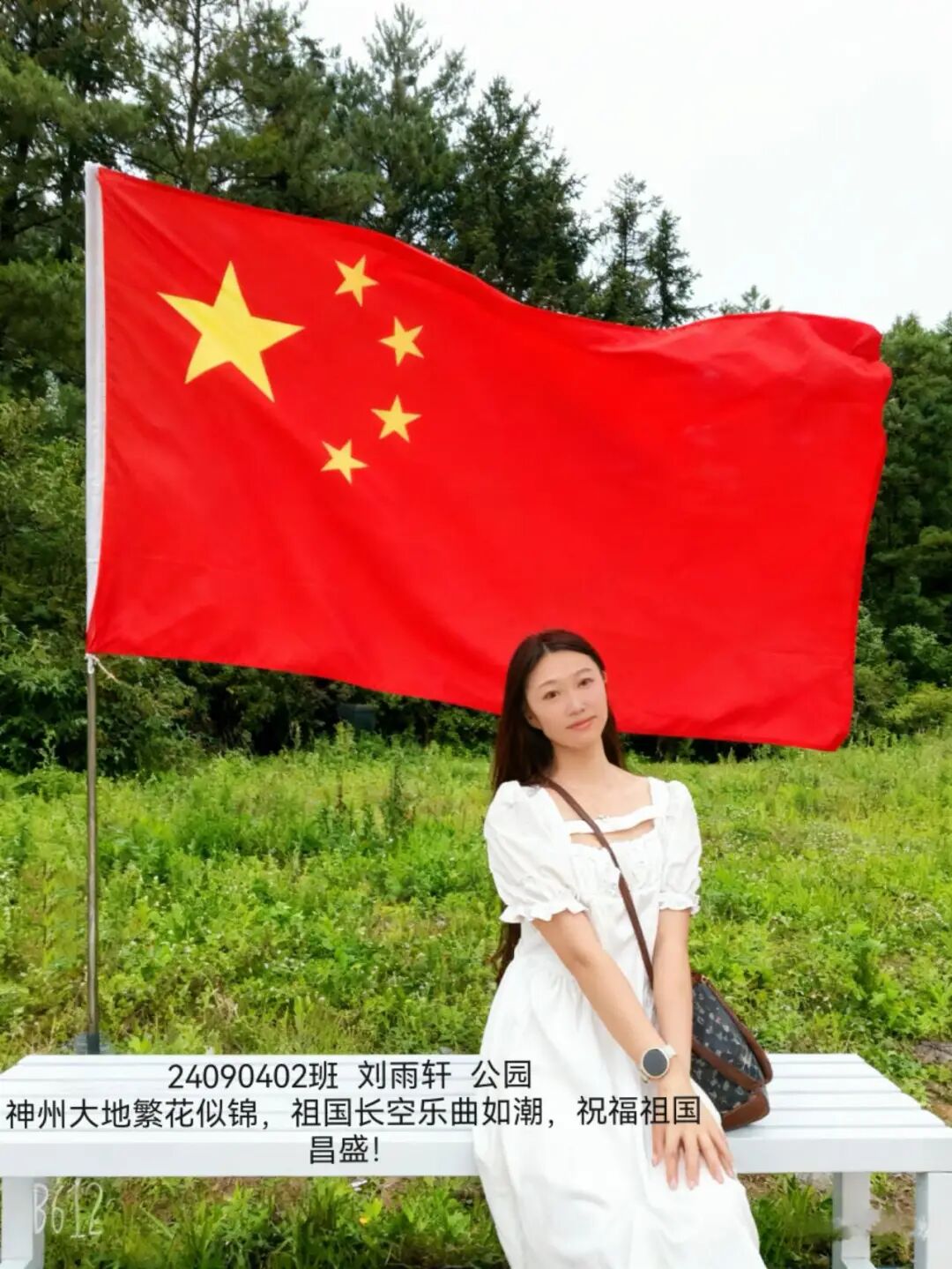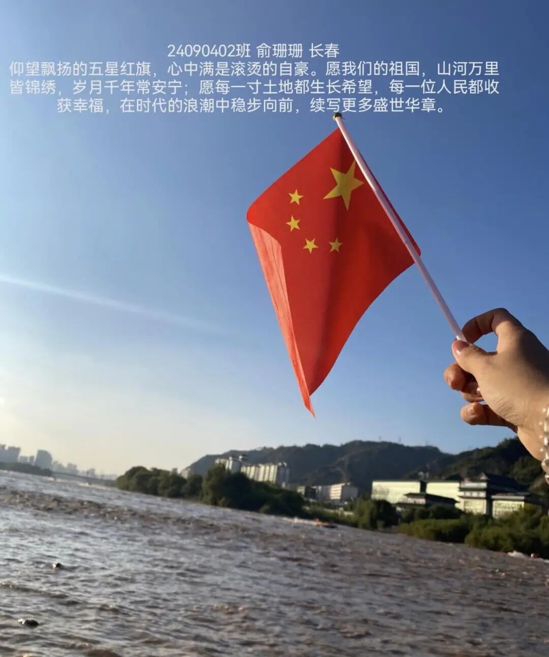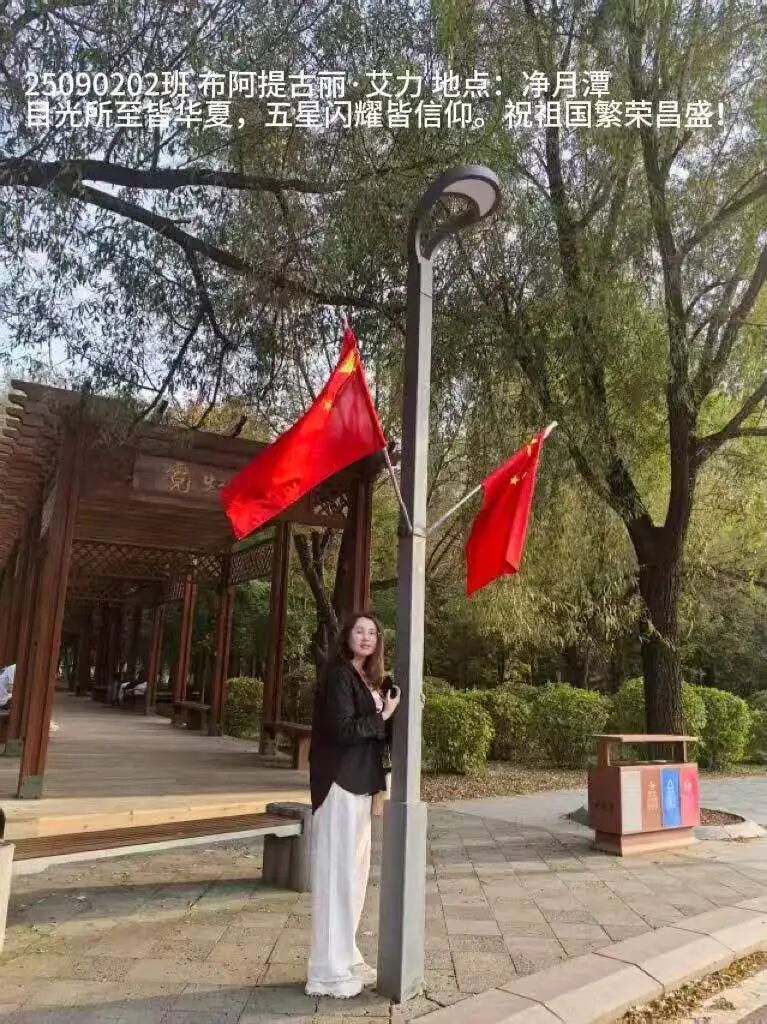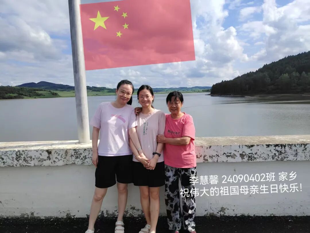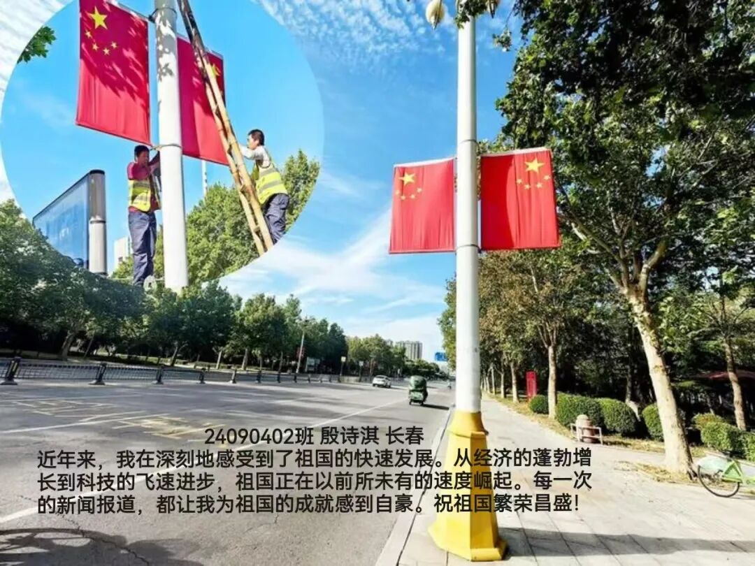 照片中,同学们手持国旗,在校园、家乡街头、旅行途中纷纷拍下照片。有的以教学楼为背景,与国旗并肩而立;有的绽开笑容,用青春姿态致敬祖国;还有的与家人共同出镜,让爱国情怀在家庭互动中传承。一张张照片里,国旗的鲜红与同学们的笑容交相辉映,洋溢着满满的自豪感。