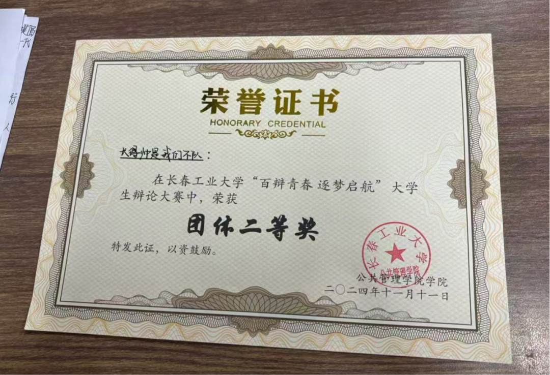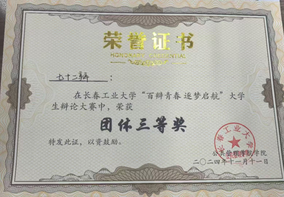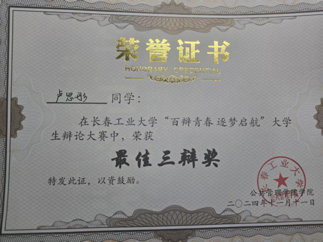2024年,社团成员在“百辩青春 逐梦启航”系列赛事中表现亮眼,斩获多项荣誉:bat365中文官方网站2024年“百辩青春 逐梦启航”校园辩论赛学院一等奖、大学生辩论赛团队二等奖与三等奖,社员卢思彤同学更是凭借出色表现荣获“最佳三辩奖”。一张张荣誉证书,既是对过往努力的肯定,更是社团凝聚力与实力的见证。