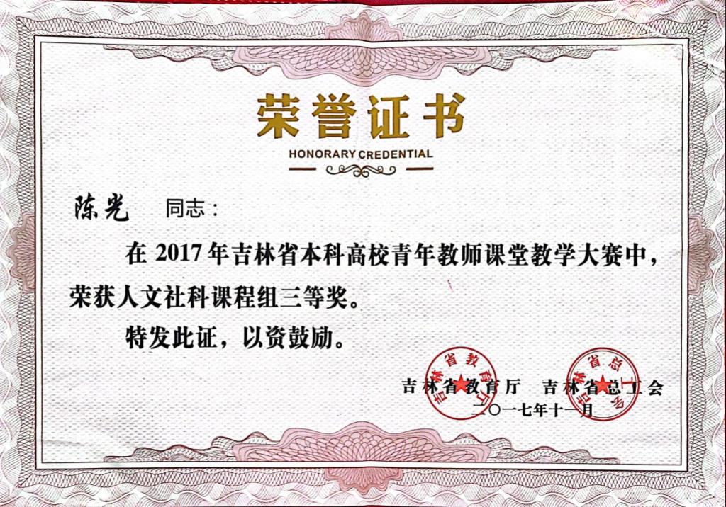 近日,bat365官网教师陈光同志在2017年吉林省本科高校青年教师课堂教学大赛中,荣获人文社科课程组三等奖。