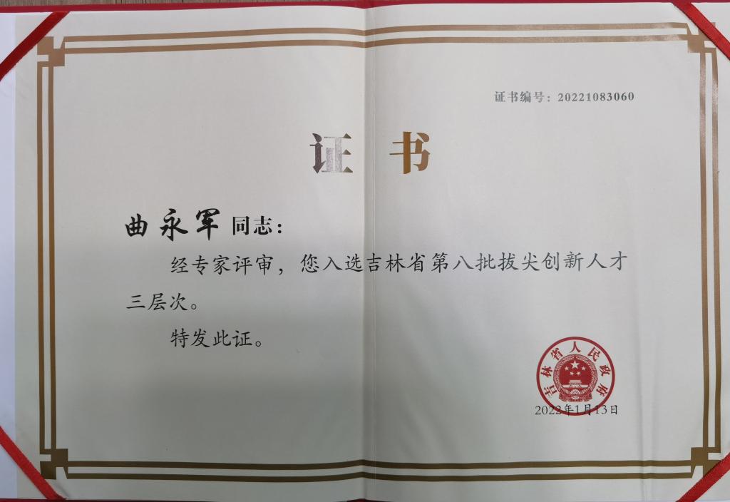 近日,bat365官网教师曲永军同志经专家评审,成功入选吉林省第八批创新拔尖人才三层次。