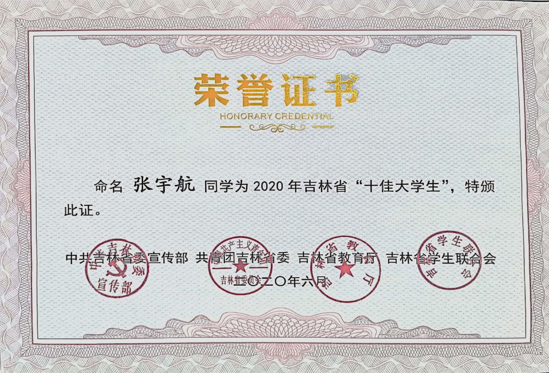 bat365官网学子张宇航荣获吉林省“十佳大学生”