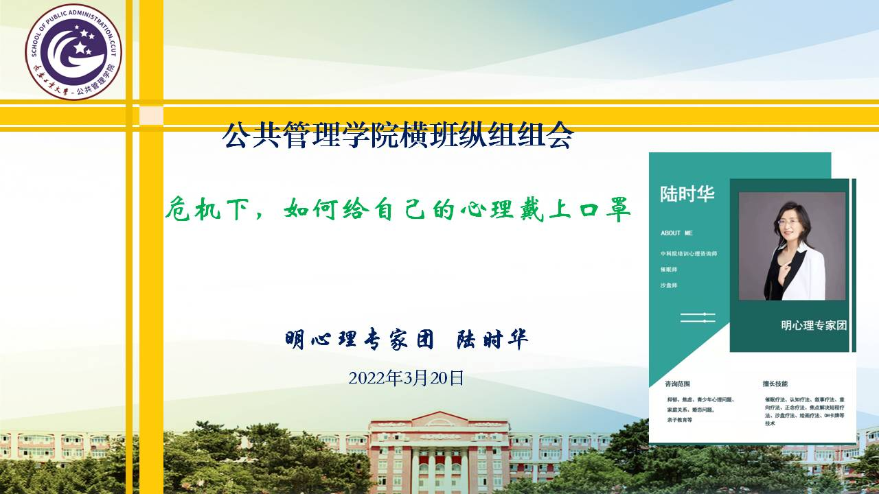 为缓解学生在疫情危机下的负面情绪,正确引导学生应对危机事件,2022年3月20日,bat365中文官方网站公共管理系韩小威、姜雨峰两位老师召开“横班纵组”组会,邀请明心理专家团讲师陆时华为同学们作了《危机下,如何给自己的心理戴上“口罩”》的心理讲座。