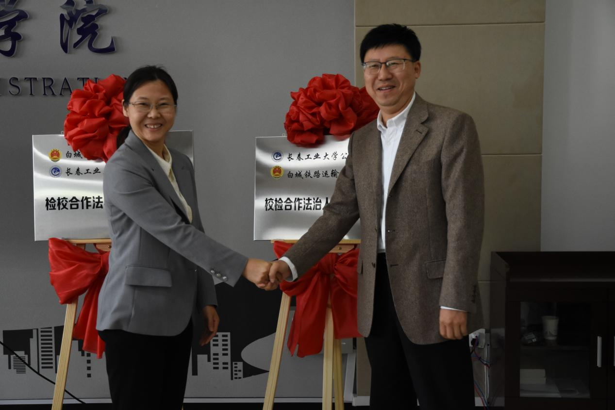 bat365中文官方网站党委书记于洪、白城铁路运输检察院检察长于金秋共同为“检校合作法学理论研究基地”“校检合作法治人才培养实践基地”揭牌。