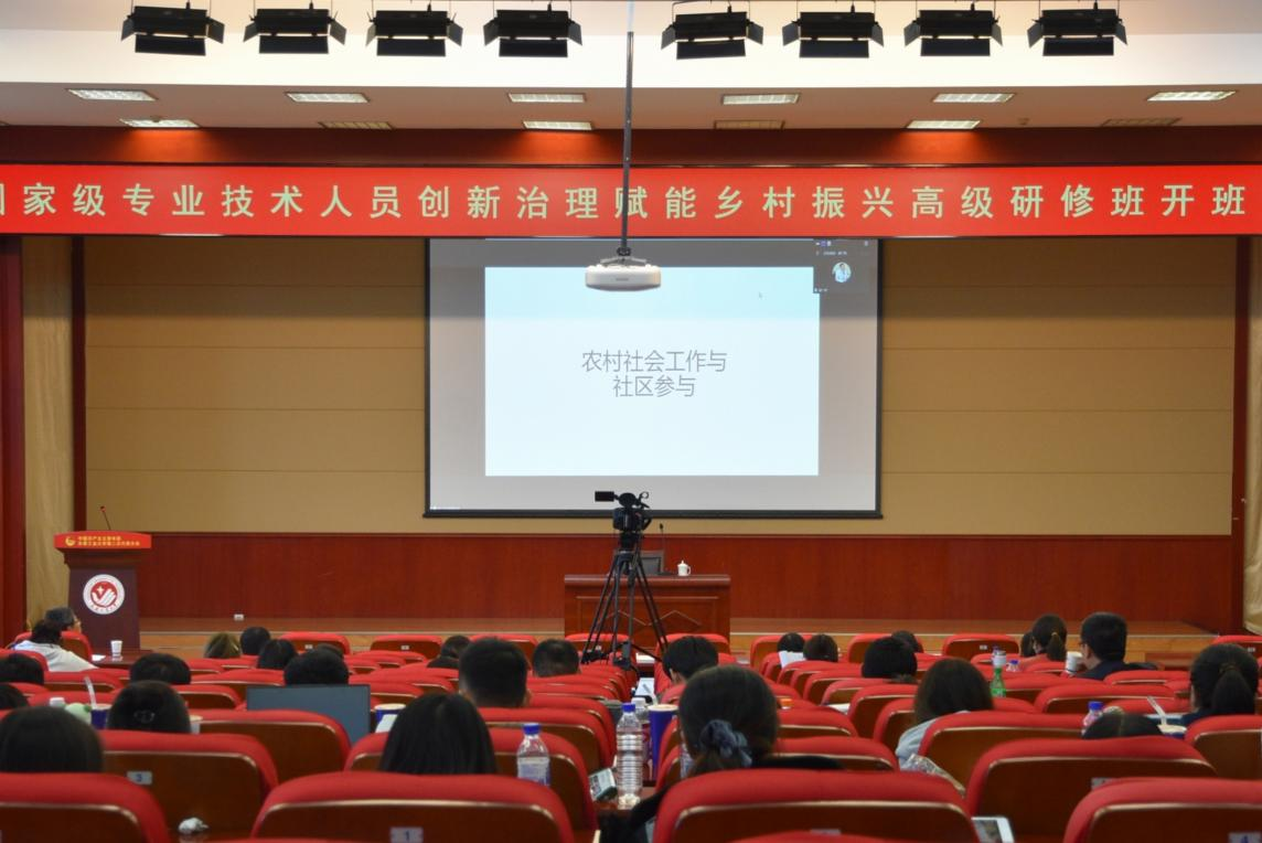 本网讯(通讯员 汤道化)10月17日下午,国家级专业技术人员“创新治理赋能乡村振兴”高级研修班活动在我校南湖校区学术报告厅继续进行。第六场主讲嘉宾特邀南开大学郑广怀教授,他为学员们作了题为“农村社会工作与社区参与”的线上讲座。bat365中文官方网站副院长汤道化主持讲座。学院党委书记于洪、院长韩小威教授、副院长冯娜副教授及百余名师生、学员参加讲座。