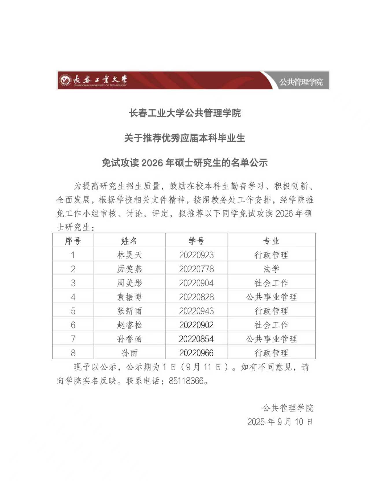 bat365中文官方网站bat365中文官方网站关于推荐应届本科毕业生免试攻读2026年硕士研究生的名单公示