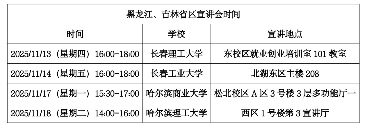 2025年11月宣讲会时间、地点:黑龙江吉林4场
