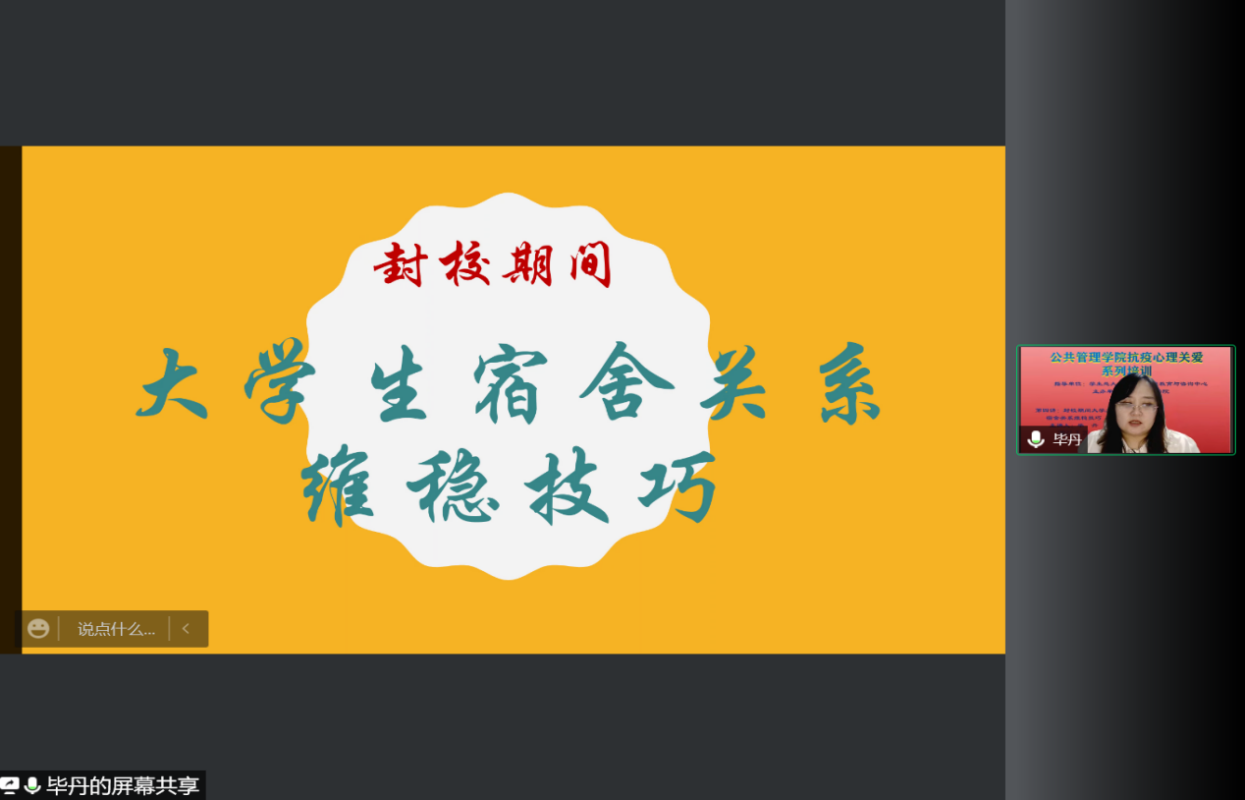 2022年3月20日晚,bat365中文官方网站举办首轮抗疫心理关爱系列讲座第四讲。本次讲座以“封校期间大学生宿舍关系维稳技巧”为主题,主讲人是社会工作系的毕丹老师。